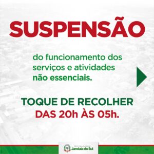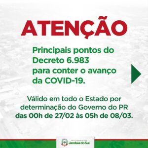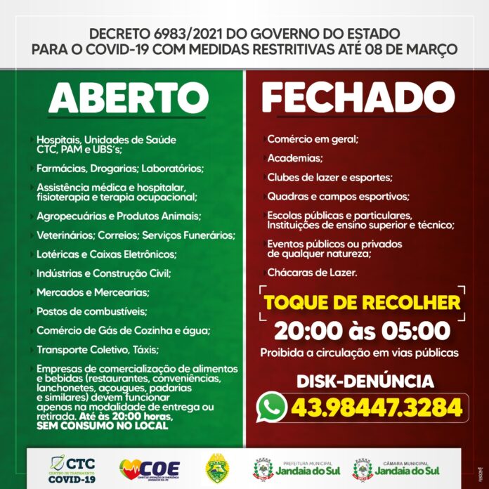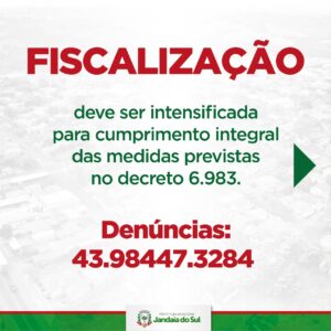 Por determinação do Governo do Estado do PR, a Prefeitura Municipal de Jandaia do Sul ampliou, desde ontem (27/02/2021), a fiscalização para cumprimento das medidas restritivas do Decreto 6.983/2021 que fica vigente até 08/03 às 05h. O Decreto suspendeu o funcionamento dos serviços e atividades não essenciais neste período.
