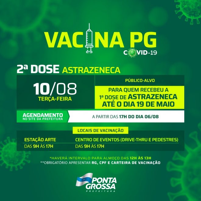 A Prefeitura de Ponta Grossa, através da Fundação Municipal de Saúde (FMS), do Departamento de Imunização e da Atenção Primária, realizará a aplicação da segunda dose de Astrazeneca em pessoas que receberam a primeira dose até dia 19 de maio. A vacinação acontece mediante agendamento no site oficial (https://fms.pontagrossa.pr.gov.br/vacinacao/), a partir das 17h de hoje (06).