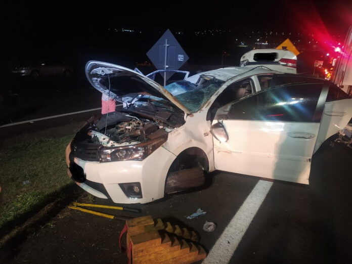 Um Toyota Corolla, com placas de Apucarana, ocupado por quatro pessoas, capotou várias vezes até parar na pista. A Polícia Rodoviária Federal (PRF) esteve no local do acidente para registrar o boletim de ocorrência.