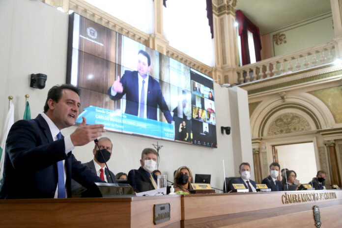 O governador Carlos Massa Ratinho Junior participou nesta terça-feira (01) da sessão de abertura dos trabalhos da Câmara Municipal de Curitiba e destacou os investimentos do Governo do Estado na Capital nos últimos anos. Entre os principais pontos, ele salientou a união entre todos os entes para o enfrentamento da pandemia de Covid-19 e para promover, de forma célere, a vacinação contra a doença.