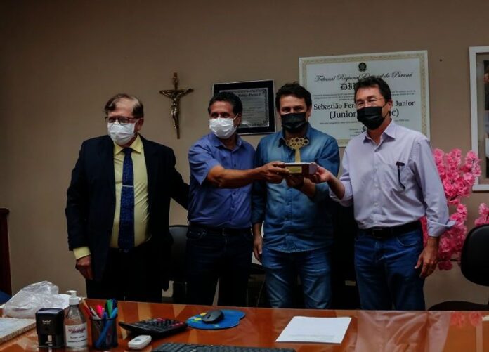 Acompanhado do secretariado municipal, o prefeito Júnior da Femac recebeu nesta terça-feira (9), das mãos dos auditores fiscais do Estado do Paraná Reginaldo de França, José Américo de Silva Pinto e José Carlos Guidotti, a premiação obtida pela Secretaria Municipal de Meio Ambiente junto ao 9ª Prêmio Gestor Público Paraná (PGP-PR), ao vencer a categoria “Meio Ambiente” com o Programa “Apucarana Mais Verde”. No mesmo ato, Júnior recebeu ainda o certificado de menção honrosa, conquistado pela Secretaria da Assistência Social com o Programa “CRAS Itinerante” – Cidadania para Todos.