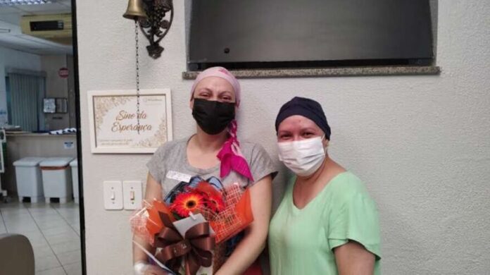 Cristiane iniciou seu tratamento contra um câncer de mama em março e fez muitos amigos pelo caminho, como a ex-paciente Márcia Moreno, que estava presente no dia em que Cristiane tocou o sino. “Fazíamos juntas para as sessões. É uma surpresa muito boa ter ela aqui hoje”, afirma Cristiane.