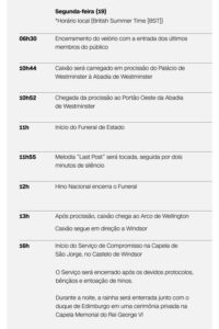 Desde que chegou ao Westminster Hall, os britânicos podem participar de uma vigília ao caixão da monarca. O velório público será encerrado às 06h30 do horário local (2h30 no horário de Brasília). A expectativa é de que o funeral na abadia seja iniciado às 11h, no horário local.