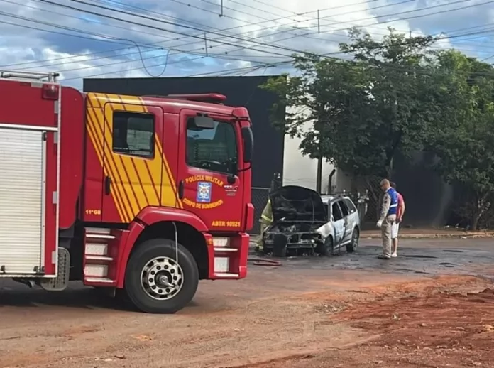 Um carro ficou totalmente destruído após pegar fogo no final da tarde deste domingo (8), em Apucarana. O incêndio foi registrado na Rua Carlos Sartini Neto, localizada no Parque Industrial Oeste, que dá acesso ao Bairro Veneza.