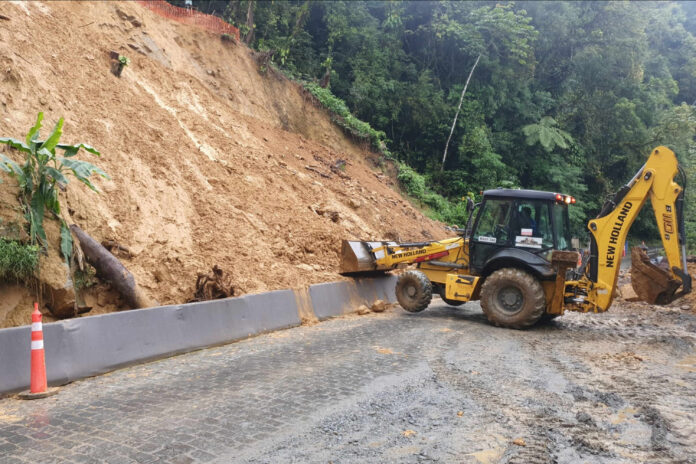 O trecho está em obras em quatro quilômetros diferentes, atingidos por escorregamento de terra, rochas e matéria vegetal devido às chuvas dos últimos meses.