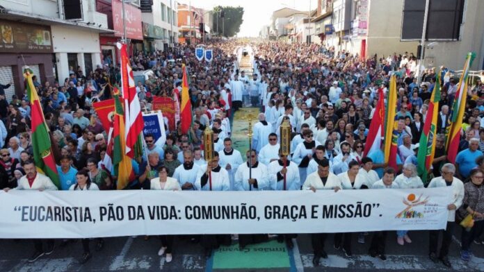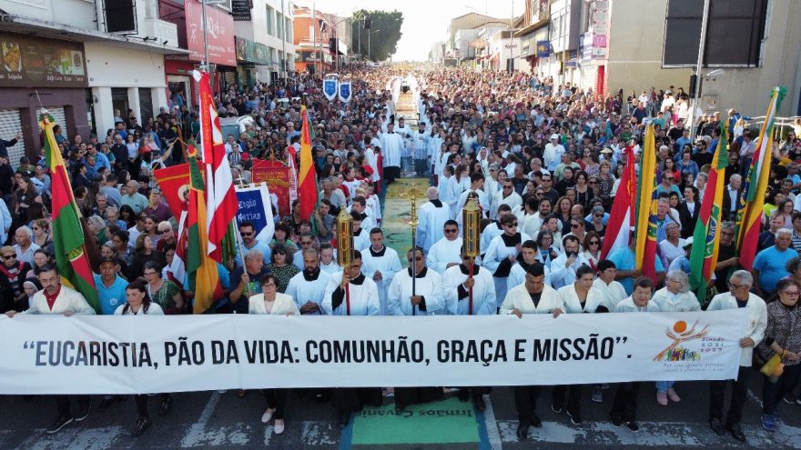 O tema ‘Eucaristia, Pão da Vida: Comunhão, Graça e Missão’ norteou a decoração dos conhecidos tapetes, assim como aos três jubileus do bispo Dom Sergio Arthur Braschi. Dom Sergio, ao final da procissão, fez questão de agradecer todas as mensagens de carinho recebidas. “Tapetes preparados com tanto carinho e que falam do amor que nos alimenta, alimenta o mundo. Um grande exemplo de sinodalidade, de comunhão. Um testemunho público importante. Vida, graça, misericórdia, perdão, expressões que, este ano, coincidiram com a realização do Sínodo, do Ano Vocacional e da Campanha da Fraternidade. Também recordemos que o primeiro Corpus Christi quem fez foi Maria, quando viajou, com Jesus no ventre, até a casa de sua prima Isabel. A Maria missionária. Missão que hoje é nossa para que a Humanidade reencontre o caminho da fraternidade e da paz”, lembrou o bispo, pedindo um minuto de silêncio pela paz no mundo. “Agradeço, de coração, as inúmeras expressões de carinho demonstradas em diversos trechos do tapete pelos meus jubileus de 50 anos como padre, 25 anos de bispado e de 20 anos em Ponta Grossa, que vamos comemorar todos juntos no dia 8 de julho”, destacou.
