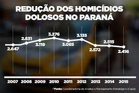 No Paraná o número de homicídios dolosos (incluindo feminicídios) registrou queda de 8,7% em todo o Paraná no primeiro semestre deste ano em comparação com o mesmo período do ano anterior. Foram registrados 932 homicídios dolosos de janeiro a junho de 2023, contra 1.021 no mesmo período em 2022, uma redução de 89 crimes. O mês com menos casos em 2023 foi justamente junho, com 108.