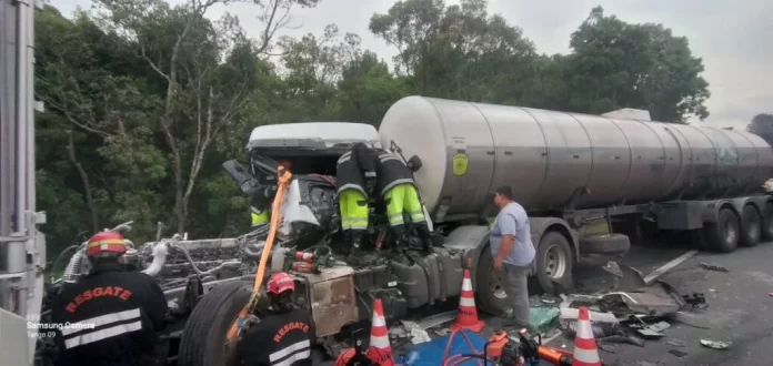 A ocorrência foi no km 40 da rodovia BR-116, sentido São Paulo. Um dos caminhões bateu na traseira da carreta à frente, que, com o impacto, acertou outro caminhão mais à frente.