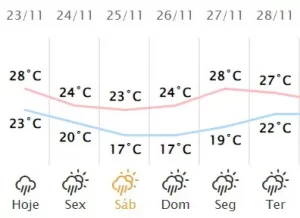 Na segunda e na terça-feira, dias 27 e 28, a chuva deve ganhar um pouco mais de força na cidade e as temperaturas deverão subir um pouco, mas ainda assim não alcançarão os 30ºC – confira abaixo a previsão do Simepar para os próximos dias em Maringá.