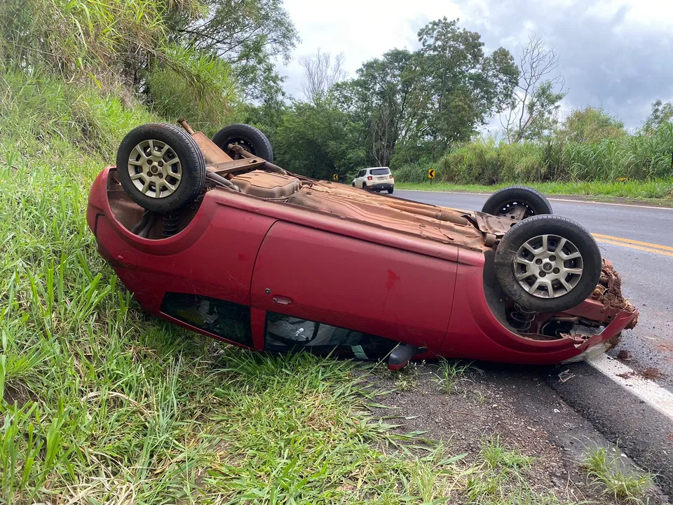 A motorista informou que capotou o carro ao desviar de um animal que cruzou a pista.