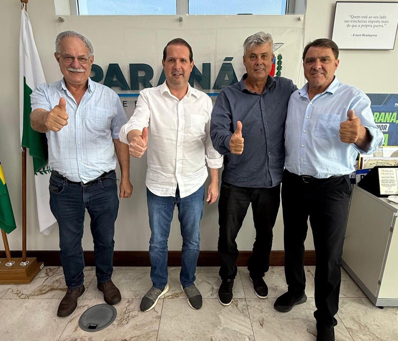 Na Casa Civil do Governo do Paraná, o prefeito foi recebido pelo subchefe da pasta, Lúcio Mauro Tasso, onde discutiu tratativas para a liberação de recursos destinados a diferentes áreas. A reunião também contou com a presença de lideranças municipais, como o presidente da Associação dos Municípios do Paraná (AMP) e prefeito de Assis Chateaubriand, Marcel Micheletto, e o prefeito de Alto Paraná, Claudemir Jóia Pereira, o “Palito”.