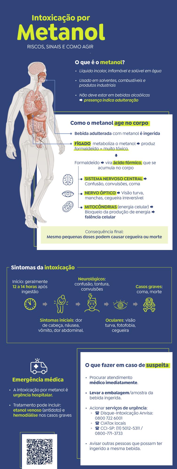 A intoxicação por metanol é uma emergência médica de extrema gravidade. A substância, quando ingerida, é metabolizada no organismo em produtos tóxicos (como formaldeído e ácido fórmico), que podem levar à morte.