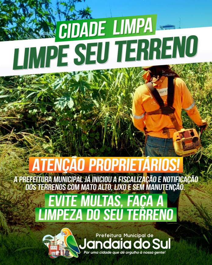 A Prefeitura Municipal de Jandaia do Sul alerta que faltam apenas cinco dias para o término do prazo concedido aos proprietários de terrenos baldios e calçadas que ainda não realizaram a limpeza adequada de seus imóveis. Após esse período, os serviços passarão a ser executados pelo município, com cobrança dos custos no IPTU e aplicação de multas, conforme a legislação vigente.
