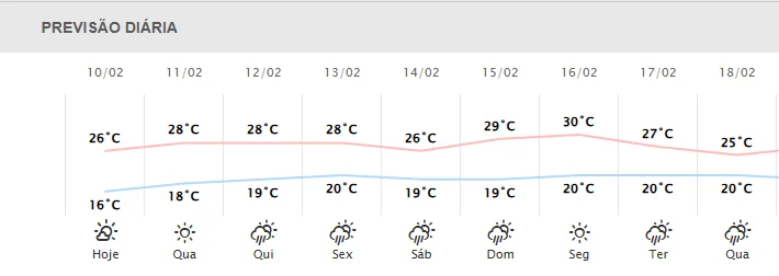 A partir dos dias seguintes, contudo, o tempo começa a virar. Não que o calor vai embora, longe disso. Mas é que pancadas de chuva devem voltar a ser registradas entre a quinta-feira e o domingo (dias 12 e 15 de fevereiro). Somente na segunda de Carnaval (dia 16) há previsão de céu claro e sem chuva na Capital, ao menos por ora.